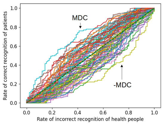 In Figure 3 we show ROC curves for each variable and its opposite, which can be interpreted as reflecting the sensitivity of each variable in classifying the subject. These curves are obtained without any training of any additional parameters, thus, this reflects the degree to which each variable correlates or does not correlate with healthy/patient sign. From Figure 3, it appears that the MDC variable reaches a sensitivity (rate of correct recognition of patients) of approximately 0.79.