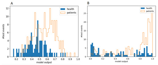 Distributions of predictive model output values based on logistic regression (A) and deep neural network (B). The histograms summarize the values for all five independent test samples.