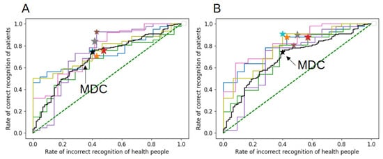 Sensitivity and specificity are two important measures used to evaluate the accuracy of diagnostic tests. High sensitivity is crucial for identifying all patients with a particular condition, while high specificity is crucial for excluding patients who do not have the condition. ROC analysis is used to evaluate the quality of a binary classification. The ROC curves of five models tested on the five independent test sets used in the linear regression (Figure 5A) and deep neural network (Figure 5B) are depicted below. The asterisks indicate the optimal values—the highest value of the ratio of sensitivity and specificity. The profiles of the ROC curves display some scatter due to the limited statistics available. However, the ROC curves for the five independent samples have similar binary classification qualities. Additionally, we generated the ROC curve for the MDC variable. In this scenario, there is no need to train any variables, allowing us to plot the curve for MDC using the entire available dataset. Despite the limited datasets for network training and validation, both linear regression and deep neural network models showcase a slightly higher sensitivity, indicating that the network integrates the cumulative performance of all utilized variables.