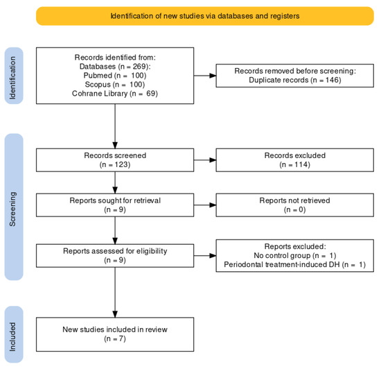 The initial search of all sources yielded 269 entries. Before screening, duplicated articles (146 entries) were removed. After screening titles and abstracts, articles unrelated to this systematic review (114 entries) were eliminated. As a result, nine articles were retained for the full-text review, whereas two articles were excluded (no control group, DH caused by periodontal treatment). The remaining seven reports were included in this review [27,28,29,30,31,32,33]. A flowchart of the study selection process is shown in Figure 1.