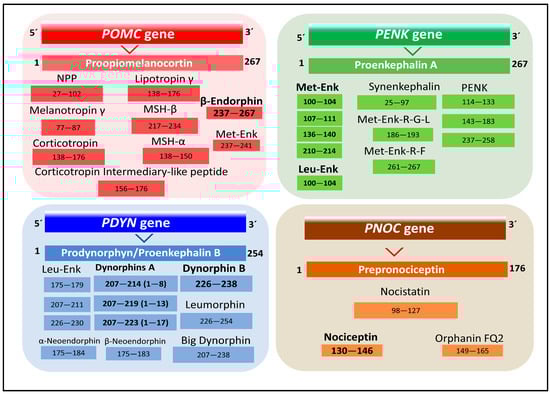 Three genes, namely PDYN, PENK, and POMC, encode multiple endogenous peptides forming three distinct families of classical endogenous opioid peptides. A fourth gene, PNOC, encodes a group of non-classical opioid peptides more recently discovered to be closely related to opioid physiological action [19,20] (Figure 1). Endogenous opioid peptides may be classified into different families according to their preferential affinity for the four opioid receptors (OR), the so-called classical μ, δ, κ (MOP, DOP, KOP), and the opioid-related nociceptin/orphanin (NOP), respectively, into endomorphins, β-endorphins, enkephalins, dynorphins, and nociceptins [19,21]. A fifth opioid-like receptor type with a role in cell proliferation, activated by methionine-enkephalin (MET), acts at the nucleus membrane and is named the opioid growth factor receptor, or receptor zeta (ζ) (OGP/ZOP) [19,22,23]. The receptor has no sequence homology or structural resemblance with the opioid receptors, but naltrexone antagonizes methionine-enkephalin’s specific binding and action on ZOP [22].