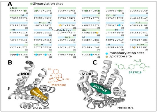 Primary structure and helices organization of the MOP receptor, depicting posttranslational modifications (A) [19,49,50]. An external view from the extracellular site of the structure of human MOP bound to the agonists morphine (B) and SR17018 (5,6-dichloro-3-[1-[(4-chlorophenyl)methyl]piperidin-4-yl]-1H-benzimidazol-2-one) (C) shows the interaction of both agonists with transmembrane domains 3, 6, and 7. Figures were obtained from the Protein Data Bank [51] and correspond to PDB ID 8EF6 and 8EFL [52] and drawn with the free web-based open-source toolkit Molstar (https://molstar.org/ (accessed on 17 May 2023) [53]. Two-dimensional structures of morphine and SR17018 were drawn with KingDraw software [54] (version 1.1.0) (https://www.kingdraw.cn/en/ (accessed on 17 May 2023)).
