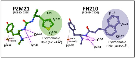 The agonist FH210 fits its naphthyl group in the hydrophobic indentation delimited by residues of the transmembrane domains 3 and 2 better than the thiophene group of PZM21 does (Figure 4). This binding mode may explain a stable conformation that favors the receptor activation of Gi protein more successfully than PZM21, avoiding β-arrestin signaling [62]. These observations open new perspectives concerning drug design targeting specific receptor transducers and possible biased intracellular responses [63].