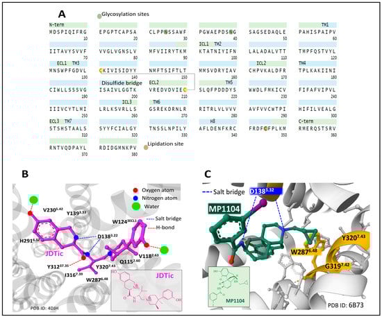 The primary structure and domains of the KOP receptor with the indication of posttranslational modifications (A) [19,49,50]. The structure of human KOP is bound to the selective antagonist JDTic ((3R)-7-hydroxy-N-[(2S)-1-[(3R,4R)-4-(3-hydroxyphenyl)-3,4-dimethylpiperidin-1-yl]-3-methylbutan-2-yl]-1,2,3,4-tetrahydroisoquinoline-3-carboxamide) (2D structure in the inset), indicating some amino acid contacts which secure its position within the orthosteric cave (B). The binding of non-selective agonist MP1104 (N-[(4R,7R,7aR,12bS)-3-(cyclopropylmethyl)-9-hydroxy-2,4,4a,7,7a,13-hexahydro-1H-4,12-methanobenzofuro[3,2-e]isoquinolin-7-yl]-3-iodobenzamide) (2D structure in the inset) to KOP reveals the ionic interaction of the ligand with D1383.32 and the hydrophobic hole delimited by W2876.48, G3197.42, and Y3207.43 (C). Figures obtained from the Protein Data Bank [51] correspond to PDB ID 4DJH [71] and 6B73 [72], drawn with the free web-based open-source toolkit Molstar (https://molstar.org/ (accessed on 17 May 2023)) [53]. Two-dimensional structures of JDTic and MP1104 were drawn with KingDraw software (version 1.1.0) (https://www.kingdraw.cn/en/ (accessed on 17 May 2023)). Amino acid residues are numbered according to Ballesteros and Weinstein’s nomenclature [57].