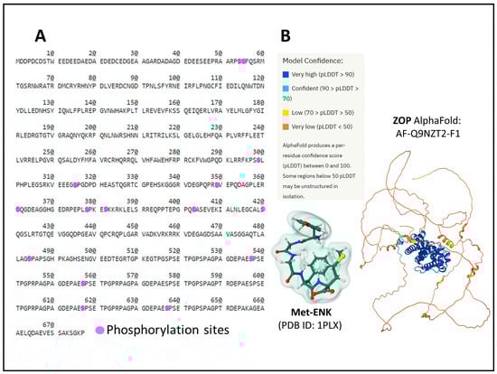The primary structure of the ZOP receptor with the indication of posttranslational phosphorylation sites (A) [19]. Panel (B) represents the AlphaFold prediction [87,88] of the human ZOP structure and the structure (Gaussian volume) of its ligand Met-ENK. The figure of Met-ENK is from the Protein Data Bank [51] and corresponds to PDB ID 1PLX [89], drawn with the free web-based open-source toolkit Molstar (https://molstar.org/ (accessed on 17 May 2023) [53]). The AlphaFold representation is from the AlphaFold Protein Structure Database (https://alphafold.ebi.ac.uk/entry/Q9NZT2, accessed on 12 June 2023)).