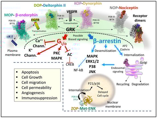 The endogenous opioid system, including opioid peptides and receptors, is widely distributed in the central and peripheral nervous system and other tissues (UniProt references P35372 for MOP; P41143 for DOP; P41145 for KOP; P41146 for NOP and Q9NZT2 for ZOP) [19]. Hence, its modulatory role in numerous biological activities, from analgesia to intermediary metabolism or cell growth control. Recent research focuses on OR distribution and capacities related to their function and dysfunction in different pathologies, including cancer (see, for example, [42,94,95,96,97,98,99]).