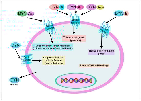 The involvement of opioid peptides in cancer has been widely demonstrated [10,11,12,13]; some studies have shown that opioids exert an antitumoral effect, whereas others have shown that opioid peptides promote tumor growth, metastasis, and vascularization [14,15,16,17,18]. Accordingly, this review aims to update the findings regarding the involvement of opioid peptides (enkephalins, endorphins, and dynorphins) in cancer development (e.g., mitogenesis, metastasis, angiogenesis); to suggest anticancer therapeutic strategies targeting the opioid peptidergic system (e.g., using opioid-receptor antagonists) and to highlight the main research lines to be developed in the future focused on the involvement of enkephalins, endorphins, and dynorphins in tumor development and progression.