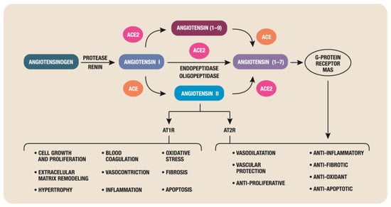 - Protective arm-ACE2-Ang (1–7)-MasR receptor (MasR); Ang (1–7) interacts with MasR to promote vasodilation, anti-inflammatory effects, antifibrotic effects, anti-proliferative effects, and vascular protection and mediates endothelial nitric oxide synthase activation and suppress apoptosis, negatively regulating RAS. The Ang (1–7) is produced either by the cleavage of Ang II by ACE2 or through the metabolism of inactive Ang (1–9) (cleaved from Ang I by ACE2). The cardiac antihypertrophic actions of Ang II and Ang (1–7) are mediated through the activation of Ang type 2 receptors (AT2R) and MasR, respectively [19]. Since only AT1R is blocked, using an ARB (angiotensin receptor blockers) for the therapy of COVID-19 patients may have favorable outcomes because any formed Ang II may have anti-inflammatory effects through its interaction with AT2R or through conversion by residual ACE2 to Ang (1–7) acting through AT2R, MasR, and Mas-related G protein-coupled receptor D) [20]. Thus, by preventing or reversing Ang II-induced cardiac hypertrophy, AT1R inhibition or activation of AT2R and Mas receptors as well as decreased oxidative stress may have a cardioprotective role.