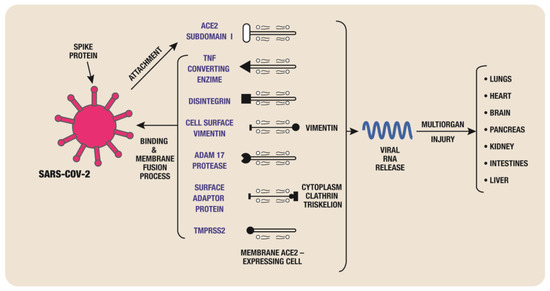3.1.1. The ACE2 receptor, which is widely expressed on the surface of a variety of human cells, including those in the respiratory tract, lungs, heart, and other organs, is recognized and bound to the spike protein on the surface of SARS-CoV-2 [18].