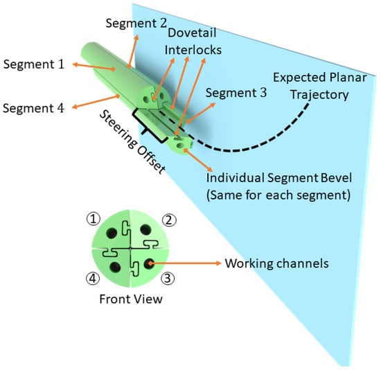 The bio-inspired PBN design features multiple bevel-tip segments (generally four segments with multiple lumens per segment) held together through an interlocking mechanism. It uses the relative motion of the segments to generate a dynamic offset at the tip that enables steering during the insertion process, as illustrated in Figure 1. Control over the shape of the tip is achieved by adjusting the relative insertion of the four segments, thereby influencing the needle’s steering behaviour within the tissue. The interlocked segments can slide relative to one another, and the segment in the most forward position is the “leading segment” for the movement (Segment 4 in Figure 1). The steering offset affects how much the segment deflects due to tissue interaction forces during insertion. The radius of curvature during probe insertion depends on this offset. By creating an offset between the segments and pushing forward, a desired trajectory can be obtained. The offset parameter affects the radius of curvature when inserting the probe [].
