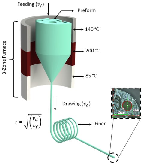 In contrast to the default speed of 250 mm/s, the print core travel speed was adjusted to 40 mm/s to create smoother surfaces. For transparent PC printing, the following temperatures were taken into account: nozzle temperature °C and bed temperature °C. The dimensions of the 3D printed preform were 40 mm for the diameter and 100 mm for the length. The central lumen of the preform was 8.6 mm in diameter, and the targeted draw ratio was 40 to reach 0.21 mm central lumen. Feeding the preform into a three-zone furnace with a speed of m/min and pulling the fibres at m/min, the 4 cm diameter preform with a 10 cm drawable preform length yielded 160 m of PBN sections. The temperature of the three-zone furnace used to thermally draw the fibre was as follows: top zone—140 °C, middle zone—200 °C, and bottom zone—85 °C. A schematic representation of the thermal drawing process can be seen in Figure 3.