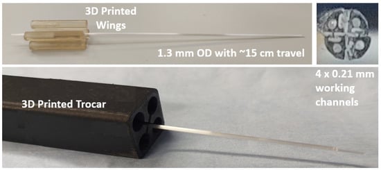The thermal drawing process produced a long PBN-shaped fibre segment with a radius of 0.65 mm and, afterwards, the long fibre segment was trimmed to the desired length of 200 mm, which was chosen to match the existing prototype described in []. As in many previous studies, each short segment was fixed to 3D printed "wings", where were used to assemble each with an actuation mechanism, and needle assembly was completed manually by interlocking four individual segments. Figure 4 shows the TD segments and their cross-sectional view. In order to minimise the chance of buckling outside of the gelatine phantom, a specially designed trocar with a 1.3 mm inner diameter was constructed and employed in the characterisation experiments. Each catheter segment had a 1 × 0.21 mm diameter working channel for sensorisation and clinical applications, and the segment tips were bevelled at an angle of 45° from the neutral axis.