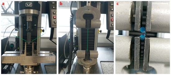 In addition, tensile tests were conducted to determine the tensile stress–strain behaviour of each PBN. The tests were performed using the same samples with a 1 kN Instron load cell with a 50 mm/min pulling velocity. Lastly, the holding capacity of the interlocking mechanism was investigated, as unwanted separation of the segments would lead to the failure of the PBN. A tensile test was employed to measure the strength of the interlocking mechanism for each prototype. The test was performed on two interlocked segments fixed together through a holder attached to the wings. The two segments were subsequently pulled out from one another with a 1 mm/min velocity. The force at the disconnection was identified by a sudden decrease in the tensile force and was taken as the breakout force. Each experiment was repeated three times. The test setups are shown in Figure 5.
