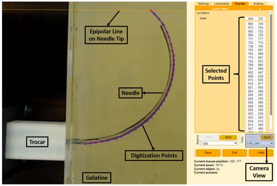 The 3D curvatures of each needle were collected using a stereo camera setup following camera calibration, shape digitization, and shape reconstruction using the R package StereoMorph []. The stereo camera setup consisted of two fixed C920 HD Pro cameras (Logitech Inc., Lausanne, Switzerland) with fixed focal lengths and overlapping fields of view, calibrated using a classic checkerboard pattern. The calibration of the two stereo cameras was undertaken using StereoMorph’s calibration process as described in []. Following each insertion, the needle was photographed using the stereo cameras, and the needle shape was manually digitized in each camera view using the StereoMorph digitizing application. We used 32 evenly spaced points to capture the curvature of each shape. Figure 6 shows an example of the digitizing tool used for one of the experiments. The purple dots show the selected digitization points from the right-side camera, and selected points appear on the right-hand side of the program. In addition, the application shows the epipolar lines from the base and tip of the needle to match the left and right camera images. Following point selection, the digitization points were interpreted using the Bezier curve approach, which is embedded in the application. The digitized curvatures were then reconstructed from base to tip in 3D according to the calibration coefficients identified offline. Finally, refractive index correction was taken into account to compensate for the measurements obtained from the gelatine medium.