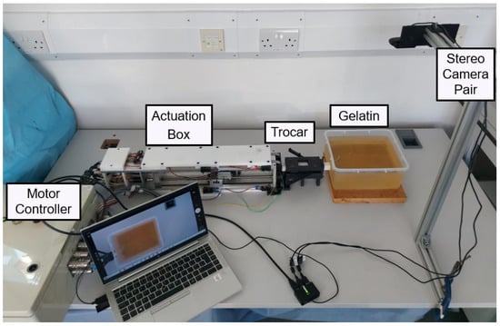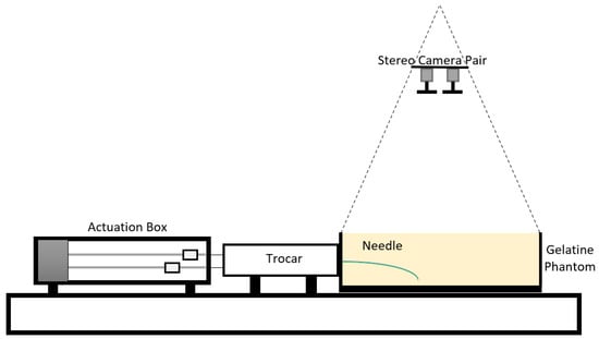 Diagram of the experimental setup: the actuation box moves the needle in the trocar, the needle is inserted into the gelatine phantom, and the stereo camera set is placed on the top of the gelatine box.
