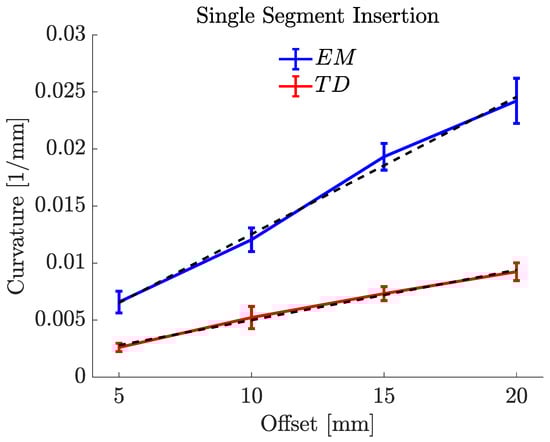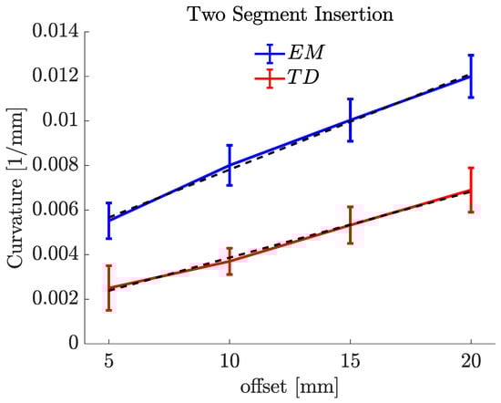 The same experiments were conducted with two forward segments, as shown in Figure 11. The maximum curvature achieved for the EM PBN with two forward segments was , which corresponded to a radius of curvature of . The maximum curvature achieved for the TD PBN with two forward segments was , which corresponded to a radius of curvature of . Table 3 shows the experimental results for the two-segment insertions. The first column shows the offsets for each catheter, and the last two columns of Table 3 report the mean curvature ( (mm)) and radius of curvature (R (mm)). The insertion angle is not reported because the curvatures here were measured in 2D, as they were performed in the plane normal to the camera line of sight. The reason for the difference between the single segment and the two segments is discussed in our previous study []. It relates to the effective stiffness of the programmable bevel achieved with two segments compared to just one. In Figure 10 and Figure 11, there is a linear relationship between curvature and offset, and we can see this with both needle types.