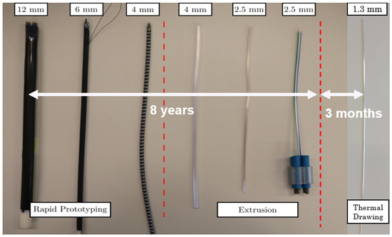 This study presents an alternative technique to manufacture complex-shaped needles and catheters with sizes exceeding conventional extrusion limits. Using thermal drawing, it was shown that it is possible to produce sub-millimetre segments with high tolerance and precise shape control. Considering the length of time needed to miniaturise each successive PBN prototype (Figure 12) using conventional manufacturing techniques, it took over eight years to reduce the size of our very first 12 mm prototype down to 2.5 mm. However, the thermal drawing method allowed us to achieve a 50% reduction over three months, an achievement that will now enable the application of the steerable system described in [] to a broader range of diagnostic and therapeutic interventions.