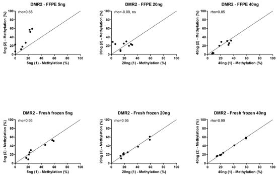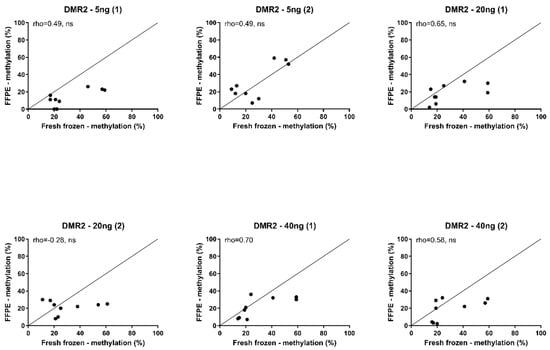 Correlation of methylation percentage in FFPE and fresh frozen tissue. Spearman’s correlation (rho) of methylation percentages between formalin-fixed paraffin-embedded (FFPE) tissue and fresh frozen tissue. Pyrosequencing was performed using primers for DMR2 CpG 2–4 in 5 ng, 20 ng, and 40 ng bisulfite-converted DNA, measured in two independent with the same concentrations of DNA assays. (1) first assay; (2) second assay. ns: not significant, p > 0.05. Reference line represents perfect replication.