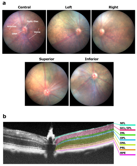Orientation of a set of five fundus images and retinal layers depicted in an OCT image. (a) Fundus images used for grading with an image having the ONH in the central position (depicting the position of optic disc, ONH, arteries and veins), the left side of the eye (ONH is oriented to the right of the image), the right side of the eye (ONH is oriented to left of the image), image with ONH oriented towards the bottom of the fundus image exposing more of the superior region and oriented towards the top of the fundus image exposing more of the inferior region of the eye. (b) For OCT image collection, each eye was oriented in the above positions to expose the peripheral regions of the eye and the entire surface of the eye was scanned using fundus image guiding. Retinal layers were clearly distinguishable on the OCT image. NFL: nerve fiber layer; GCL: ganglion cell layer; IPL: inner plexiform layer; INL: inner nuclear layer; OPL: outer plexiform layer; ONL: outer nuclear layer; PRL: photoreceptor layer; RPE: retinal pigment epithelium.