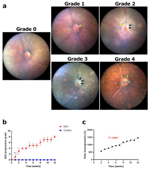 Signs of EAU and clinical grading in the optic disc using fundus images. (a) Normal optic disc before inoculation; grade 0. Onset of EAU denoted by optic disc swelling; grade 1. Yellow arrows indicate optic disc margins. Optic disc swelling followed by formation of lesions and blurry retinal blood vessels within the optic disc margins; grade 2. Black arrows indicate lesions in the optic disc. Lesions covering 10–30% of the optic disc and <30% of retinal vessels blurry due to lesions; grade 3. ONH atrophy denoted by ‘sunset’ halo and glassy opaque appearance of the optic disc; grade 4. Green arrows indicate ‘sunset’ halo around an atrophied ONH and blue arrows indicate a ‘glassy opaque’ appearance of the atrophied optic disc and ONH. (b) Each eye was graded based on the pathologies observed in a set of five fundus images collected weekly for a period of 12 weeks. A weekly clinical score for optic disc health (maximum possible score of 8) was calculated for each mouse by adding the scores for the left and right eye. An average weekly score for each mouse in the EAU (n = 6 mice) and control (n = 4 mice) group along with the standard deviation (error bars) was calculated and plotted against time. Progression of inflammation in the optic disc, tracked over 12 weeks, showed a steady increase in the clinical scores with periods of plateau giving rise to a step-like pattern. Significant differences between EAU and control group clinical scores were calculated using a multiple t-test. EAU mice had significantly higher clinical scores from week 1 (** p < 0.05) onwards with control mice showing no signs of swelling, lesions, or atrophy in the optic disc throughout the 12-week period. (c) Progression of clinical scores in weeks 2–12 relative to the onset of optic disc changes in week 1. The progression was found to be linear (r2 = 0.9827) highlighting a steady increase in disease severity.
