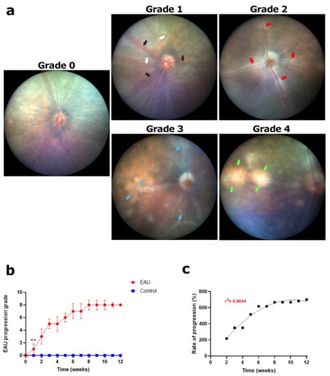 Signs of EAU and clinical grading in retinal blood vessels using fundus images. (a) Normal retinal blood vessels before inoculation; grade 0. Swelling of blood vessels (mainly veins); grade 1. White arrows indicate arteries and black arrows indicate veins. Formation of a ‘hazy sheath’ or ‘cuffing’ (red arrows) around blood vessels due to presence of perivascular infiltrates (tiny white spots). Thickness of cuffing less than thickness of blood vessel; grade 2. Perivascular lesions clumping together to form larger areas of cuffing (blue arrows). Thickness of cuffing greater than thickness of blood vessel; grade 3. Large areas of scarring and tissue damage (green arrows) obscuring blood vessels; grade 4. (b) Each eye was graded based on the pathologies observed in a set of five fundus images collected weekly for a period of 12 weeks. A weekly clinical score for retinal blood vessel health (maximum possible score of 8) was calculated for each mouse by adding the scores for left and right eye. An average weekly score for each mouse in the EAU (n = 6 mice) and control group (n = 4 mice) along with the standard deviation (error bars) was calculated and plotted against time. Signs of EAU in retinal blood vessels showed a sharp increase in the first 3 weeks followed by a steady growth, reaching the maximum possible score by week 8. Significant differences between EAU and control group clinical scores were calculated using a multiple t-test. EAU mice had significantly higher clinical scores (** p < 0.05) from week 1 onwards. Control mice showed no signs of blood vessel swelling, cuffing or scarring in blood vessels throughout the 12-week period. (c) Progression of clinical scores in weeks 2–12 relative to the onset of changes in retinal blood vessels in week 1. The progression was found to be sigmoidal (r2 = 0.9644) highlighting a rapid increase in signs in the early stages of the disease which began to slow down from week 7, reaching a plateau towards the end of the study.