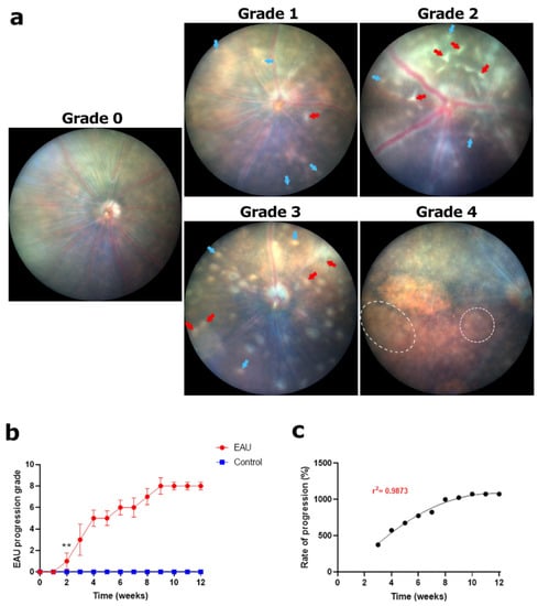Signs of EAU and clinical grading in retinal tissue using fundus images. (a) Normal retinal tissue before inoculation; grade 0. Onset of EAU with small round lesions (3–10) (blue arrows) and linear lesions (1–4) (red arrows); grade 1. Increased number of round lesions (11–30) and/or linear lesions (5–10); grade 2. Increased number of round lesions (>30) and/or linear lesions (>10) and/or small area of scaring (<10%); grade 3. Large areas of scarring (white dotted lines) (>10%) and/or retinal atrophy; grade 4. (b) Each eye was graded based on the pathologies observed in a set of five fundus images collected weekly for a period of 12 weeks. A weekly clinical score for retinal tissue health (maximum possible score of 8) for each mouse was calculated by adding the scores for the left and right eye. An average weekly score for each mouse in the EAU (n = 6 mice) and control (n = 4 mice) group along with the standard deviation (error bars) was calculated and plotted against time. Progression of EAU in retinal tissue showed a sharp increase in weeks 2–4 followed by a step-like growth before reaching the maximum possible score in week 9. Significant differences between EAU and control group clinical scores were calculated using a multiple t-test. EAU mice had significantly higher clinical scores (** p < 0.05) from week 2 onwards. Control mice showed no signs of lesions or scarring in the retina throughout the 12-week period. (c) Progression of clinical scores in weeks 3–12 relative to the onset of changes in retinal tissue in week 2. The progression was found to be sigmoidal (r2 = 0.9873), highlighting a steady increase in clinical scores in the early stages of the disease which began to slow down from week 10 onwards, reaching a plateau towards the end of the study.