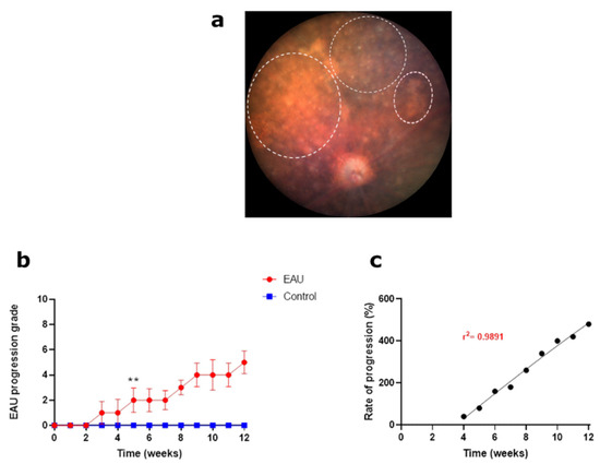 Signs of structural damage in the retina and clinical grading using fundus images. (a) Large areas of scarring seen in severe cases of retinal tissue damage which may be irreversible when EAU is resolved. No scarring; grade 0. More than 10 linear lesions or >10% region of scaring; grade 1. 10–25% region of scarring (white dotted line); grade 2. 25–50% region of scarring; grade 3. More than 50% region of scarring or retinal atrophy; grade 4. (b) Each eye was graded based on the pathologies observed in a set of five fundus images collected weekly for a period of 12 weeks. A weekly clinical score for retinal structural damage (maximum possible score of 8) was calculated for each mouse by adding the scores for the left and right eye. An average weekly score for each mouse in the EAU (n = 6 mice) and control (n = 4 mice) group along with the standard deviation (error bars) was calculated and was plotted against time. Progression of structural damage, tracked over a 12-week period, showed a step-like increase throughout the study period without reaching the maximum possible score indicating a lack of retinal atrophy. Significant differences between EAU and control group clinical scores were calculated using a multiple t-test. EAU mice had significantly higher clinical scores (** p < 0.05) from week 5 onwards. Control mice showed no signs of lesions or scarring in the retina throughout the 12-week period. (c) Progression of clinical scores in weeks 4–12 relative to the onset of structural damage in retinal tissue in week 3. The progression was found to be linear (r2 = 0.9891) highlighting a steady increase in structural damage severity.