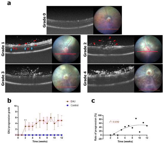 Signs of EAU in the vitreous and clinical grading using OCT imaging. The red line highlights the transverse fundus section corresponding to the OCT image. (a) Normal vitreous before inoculation which may or may not contain floaters (<20); grade 0. Infiltration of white specks into the vitreous (20–60); grade 1. Blue arrows indicate dilated blood vessels and red arrows indicate white specks in vitreous and retinal layers. Increase in the number of white specks in the vitreous (60–100); grade 2. Large, aggregated masses present in two to three OCT images; grade 3. Large dense aggregated masses present in four or more OCT images; grade 4. (b) Each eye was graded based on the pathologies observed in a set of nine vitreous-focused OCT images collected weekly for a period of 12 weeks. A weekly clinical score for vitreous health (maximum possible score of 8) was calculated for each mouse by adding the scores for the left and right eye. An average weekly score for each mouse in the EAU (n = 6 mice) and control (n = 4 mice) group along with the standard deviation (error bars) was calculated and plotted against time. Progression of changes in the vitreous, tracked over a period of 12 weeks, showed variable periods of clinical score increase with a high standard deviation indicating a fluctuation in infiltration within the EAU group. Significant differences between EAU and control group clinical scores were calculated using a multiple t–test. EAU mice had significantly higher clinical scores (** p < 0.05) from week 2 onwards. Control mice showed low numbers of white specks (<20) in the vitreous throughout the 12-week period. (c) Progression of clinical scores in weeks 2–12 relative to the onset of increasing numbers of white specks in week 1. The progression was found to be highly variable and could not be fitted to a particular trend (r2 = 0.5742).