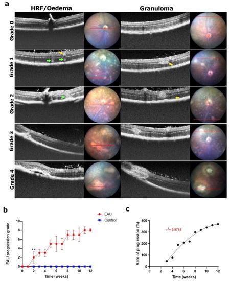 Signs of EAU in retinal layers and clinical grading using OCT images. The red line highlights the transverse fundus section corresponding to the OCT image. (a) Normal retinal layers with no pathology; grade 0. Development of HRF (green arrows; 5–10) in PRL and ONL or granulomas (yellow arrows; 5–10) in NFL, GCL, IPL and INL; grade 1. Two to five HRF advancing in size to disrupt the IPL and/or two to five granulomas enlarging to extend into the ONL; grade 2. More than two HRF advancing enough to disrupt multiple retinal layers and/or more than two granulomas enlarging to disrupt multiple layers; grade 3. HRF advancing to form more than two regions of oedema and/or granulomas enlarging in size and area to affect the entire retina; grade 4. Images in the left column depict HRF and granuloma advancement in line with EAU progression in the right column. (b) Each eye was graded based on the pathologies observed in a set of nine retinal layer-focused OCT images collected weekly for a period of 12 weeks. A weekly clinical score for retinal layer health (maximum possible score of 8) was calculated for each mouse by adding the scores for the left and right eye. An average weekly score for each mouse in the EAU (n = 6 mice) and control (n = 4 mice) group along with the standard deviation (error bars) was calculated and plotted against time. Progression of changes in retinal layers, tracked over a 12-week period, showed a step-like pattern before reaching the maximum clinical score possible in week 11. There was variability within the EAU group, as indicated by the error bars; however, by week 12, all mice showed signs of oedema and large granulomas. Significant differences between EAU and control group clinical scores were calculated using a multiple t-test. EAU mice had significantly higher clinical scores (** p < 0.05) from week 2 onwards. Control mice showed no signs of HRF or granulomas in retinal layers throughout the 12-week period. (c) Progression of clinical scores in weeks 3–12 relative to the onset of any signs of HRF or granulomas in week 2. The progression was found to be variable in weeks 3–7 following which it showed a steady rise trending towards plateauing by the end of the study period (r2 = 0.9768).