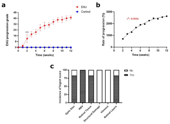 Total EAU response over the 12-week study period. (a) Grading of total EAU response combining the clinical scores from all inflammatory elements (i.e., optic disc, retinal blood vessels, retinal tissue, structural damage, vitreous and retinal layers). The clinical score from each inflammatory element for each mouse was added to obtain the total EAU response score (maximum possible score of 48) per mouse per week. An average weekly score for each mouse in the EAU (n = 6 mice) and control (n = 4 mice) group along with the standard deviation (error bars) was calculated and plotted against time. Progression of EAU, tracked over a 12-week period, showed a steady increase with very low variability (small standard deviation) indicating a uniform incidence and severity of inflammation in mice immunised with IRBP1–20 and PTX. Significant differences between EAU and control group clinical scores were calculated using a multiple t-test. EAU mice had significantly higher clinical scores (** p < 0.05) from week 2 onwards. Control mice showed no signs of EAU in any inflammatory element throughout the 12-week period. (b) Progression of clinical scores in weeks 2–12 relative to the onset of any EAU signs in week 1. The progression was found to be uniform with a steady rise trending towards plateauing by the end of the study period (r2 = 0.9912). (c) Incidence of highest (maximum possible) clinical score in EAU mice calculated at the 12-week mark. While 100% of EAU mice attained the maximum score of 8 for retinal blood vessels (RBV), only 80–85% EAU mice received the maximum score for optic disc, retinal tissue and retinal layers. None of the EAU mice obtained the maximum clinical score for structural damage and vitreous infiltrates due to slow development and high variability, respectively.
