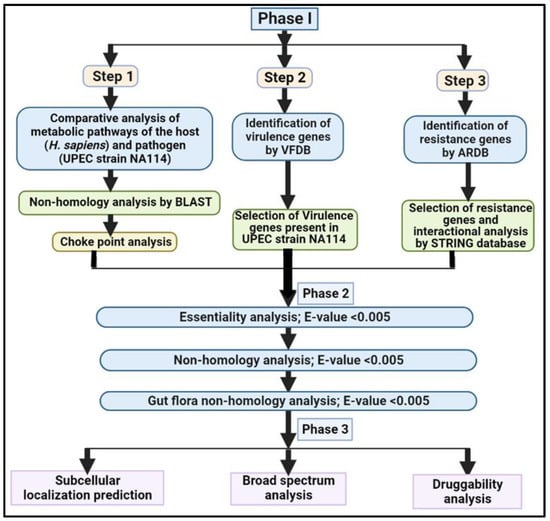 - Shahid, F.; Ashfaq, U.A.; Saeed, S.; Munir, S.; Almatroudi, A.; Khurshid, M. In Silico Subtractive Proteomics Approach for Identification of Potential Drug Targets in Staphylococcus Saprophyticus. Int. J. Environ. Res. Public Health 2020, 17, 3644. [Google Scholar] [CrossRef] [PubMed]