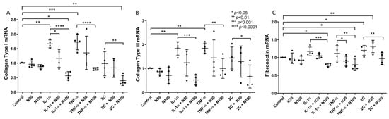 Treatment with NCL alone did not have a statistically significant effect on the mRNA expression of COL1, COL3, or FN (Figure 1A–C). However, COL1 mRNA production by SELMs in response to either IL-1α (IL-1α + N30: 1.16-fold, ±0.31, p < 0.05; IL-1α + N100: 0.53-fold, ±0.14, p < 0.0001), TNF-α (TNF-α + N100: 0.79-fold, ±0.04, p < 0.0001), or their combination (2C + N100: 0.39-fold, ±0.17, p < 0.01) was reduced after NCL treatment, with the effect of the higher concentration (N100) being more pronounced. Notably, the reduction of COL1 mRNA expression after N100 treatment of IL-1α and 2C stimulated SELMs was statistically significant even when compared to controls (IL-1α + N100: p < 0.05; 2C + N100: p < 0.01) (Figure 1A).