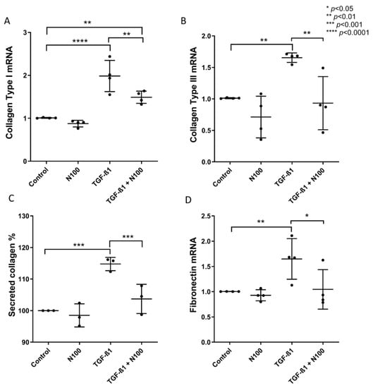 Upon stimulation with TGF-β1, mRNA expression levels of COL1 (1.98-fold, ±0.36, p < 0.0001) (Figure 2A), COL3 (1.65-fold, ±0.07, p < 0.01) (Figure 2B), as well as FN (1.64-fold, ±0.40, p < 0.01) (Figure 2D) were upregulated. The addition of N100 to TGF-β1-stimulated SELMs led to a significant reduction in the expression of COL1 (TGF-β1 + N100: 1.48-fold, ±0.14, p < 0.01), COL3 (TGF-β1 + N100: 0.93-fold, ±0.42, p < 0.01), and FN (1.04-fold, ±0.39, p < 0.05) (Figure 2D). Interestingly, even though COL1 mRNA expression after TGF-β1 stimulation was reduced in N100-treated SELMs, it still exhibited upregulation when compared to controls (TGF-β1 + N100: p < 0.01) (Figure 2A).