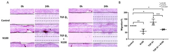 As shown in Figure 3, at 24 h after wound infliction, SELMs had formed a visible front of cells moving towards each other, closing the gap of the wound. This behavior was enhanced by stimulation with TGF-β1, where considerably more gap closure could be observed at the 24-h time point (127.3%, ±23.17, p < 0.05) (Figure 3B). N100 exposure hindered the ability of SELMs to migrate even at standard conditions (59.04%, ±16.15, p < 0.01). The debilitating effect of NCL on SELM migration was even more prominent when combined with TGF-β1 stimulation (72.44%, ±4.33), leading to a 41% reduction in migration compared to controls (p < 0.05) and a 43% reduction when compared to TGF-β1 stimulation alone (p < 0.001) (Figure 3A,B).