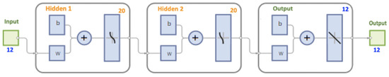 Anomaly detection refers to the problem of finding data patterns that do not conform to the expected behavior [23]. In the current research, a dataset of 1.021 volunteers was used to model the relationship patterns between the low back pain-related variables. An artificial neural network structure with two hidden layers was trained, with each of the hidden layers including tangent hyperbolic transfer and a logistic sigmoid with 20 neurons, and fully connected (Figure 1). The input layer was composed of socioanthropometric dimension-related variables (age, sex, body mass, height, and body mass index) and data from the Oswestry disability index I [31]; depression, anxiety, and stress scale [32]; and pain catastrophizing daily [33] questionnaire scores. The output layer contained the same information but with a randomized subject order. The output space consisted of a “1” or “2” binary classification, indicating “no change” and “change” in the general functional profile (respectively). The learning algorithm used was Bayesian regularization. The dataset was randomly split into 80% of samples for training and 20% for testing.