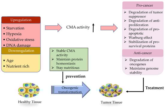 Figure 2. The impact of the CMA pathway on cancer and its prevention and treatment. CMA activity is altered by several factors (upregulation: starvation, hypoxia, oxidative stress, DNA damage; downregulation: age, nutrient richness), and it generally exhibits upregulated activity in tumor tissues. On the one hand, highly active CMA can promote tumor growth by degrading tumor suppressors and other factors. On the other hand, highly active CMA can inhibit tumor growth by degrading oncogenic factors, etc. Taking appropriate measures (such as maintaining protein homeostasis and so on) can prevent healthy cells from malignantly transforming into tumor cells. The dual effects of CMA on cancer were used to treat cancer tissue.