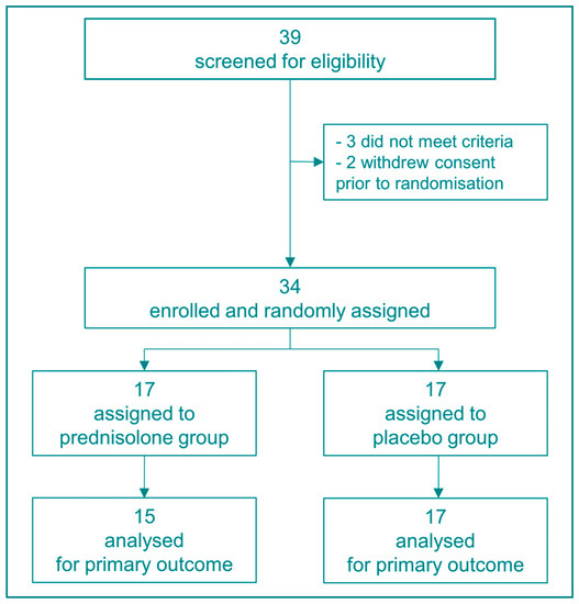 We screened 39 potential participants from May 2020 to December 2022, of whom 34 completed the study with 17 randomised to prednisolone and 17 to placebo treatment (Figure 1 and Table 1). There were no missing data on baseline information. All participants were compliant to medicine intake according to the predefined criteria (i.e., >70%). A total of 15 participants experienced adverse events (8 in the prednisolone group and 7 in the placebo group). Although no serious adverse events were registered, one participant in the combined active prednisolone and placebo curcumin group suffered from epistaxis and terminated the study treatment on day 8 as per investigator instruction. The trial was completed when 34 participants finished the study, as per our sample size estimate.