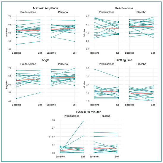 Spaghetti and scatter plots for the thromboelastography measurements split into the two treatment groups—before and after treatment. Red line denotes mean at baseline and EoT. Abbreviations: EoT: end of treatment.