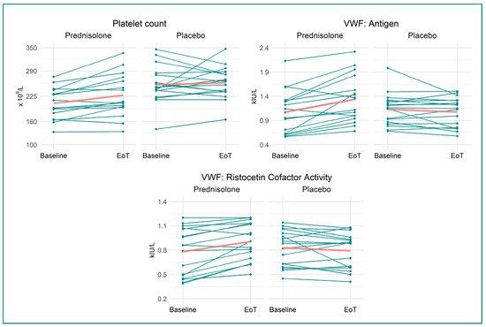 Spaghetti and scatter plots for the primary haemostasis measurements. Split into the two treatment groups—before and after treatment. Red line denotes mean at baseline and EoT. Abbreviations: EoT: end of treatment; VWF: von Willebrand factor; kIU/L: kilo international units per litre.