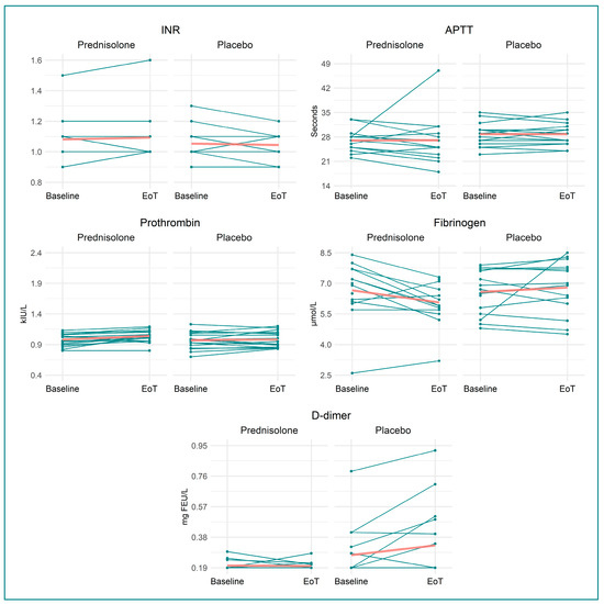 We observed no changes in markers of the extrinsic nor intrinsic pathway (both INR and APTT were unchanged in the prednisolone-treated group), consistent with a previous RCT [10]. In the common pathway, we found a slight increase in prothrombin in the prednisolone group, a marker that had not been investigated in this context prior to the current study. Additionally, we found that fibrinogen decreases in prednisolone treatment, which contradicts prior knowledge [10]. Despite the changes in prothrombin and fibrinogen, D-dimer levels did not seem to change in the prednisolone-treated group, as previously observed [9,10,12].