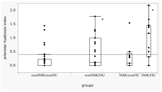 Box-and-whisker plots of the arteriolar hyalinosis index across the SMK/HU groups. Boxes indicate medians with IQRs. Error bar maximum and minimum values defined as the third quartile + 1.5 times the IQR and first quartile − 1.5 times the IQR, respectively. Outliners are defined as date points > 1.5 times the IQR beyond the first or third quartiles. Differences in the arteriolar hyalinosis index across each group were evaluated using the Steel test, with non-SM/non-HU used as a reference. p < 0.05 (one-way ANOVA). * p < 0.05 compared with non-SMK/non-HU. HU, hyperuricemia; IQR, interquartile range; SMK, smoking.