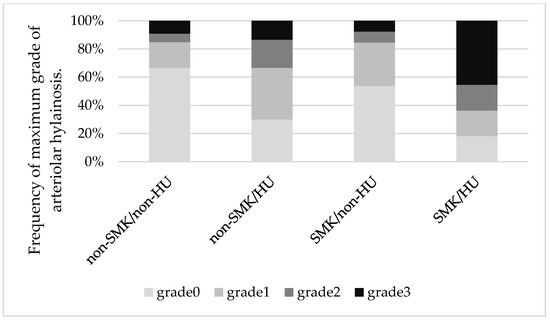 We analyzed the indices of hyalinosis for each SMK/HU subgroup. The hyalinosis index in the SMK/HU subgroup was the highest among the groups (Figure 1). The rate of the higher max grade for the hyalinosis index (G2 + G3) was the highest in the SMK/HU subgroup (Figure 2).
