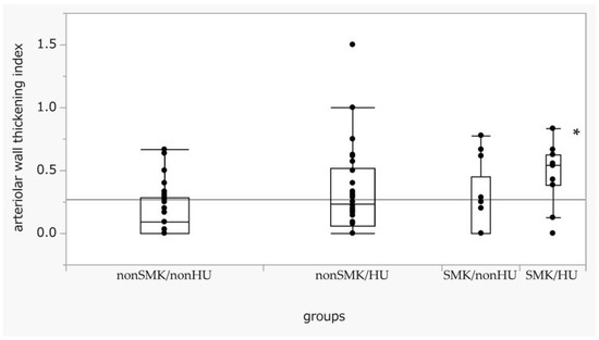 Box-and-whisker plots of arteriolar wall thickening across the SMK/HU groups. Differences in the arteriolar wall thickening index across each group were examined using the Steel test, with non-SM/non-HU used as a reference. p < 0.05 (one-way ANOVA). * p < 0.05 compared with non-SMK/non-HU. SMK, smoking; HU, hyperuricemia.