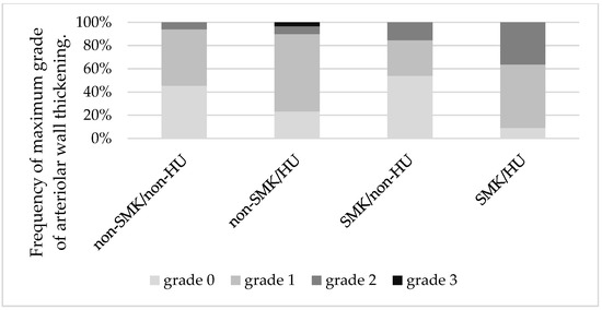 We analyzed the indices of wall thickening for each SMK/HU subgroup. The wall thickening index in the SMK/HU subgroup was the highest among the groups (Figure 3). The rate of the higher max grade for the wall thickening index (G2 + G3) was the highest in the SMK/HU subgroup (Figure 4).