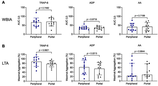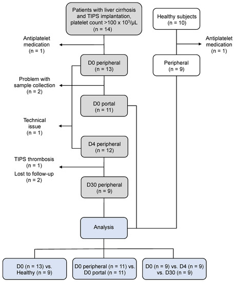 - Brusilovskaya, K.; Simbrunner, B.; Lee, S.; Eichelberger, B.; Bauer, D.; Zinober, K.; Schwabl, P.; Mandorfer, M.; Panzer, S.; Reiberger, T.; et al. Peripheral versus central venous blood sampling does not influence the assessment of platelet activation in cirrhosis. Platelets 2022, 33, 879–886. [Google Scholar] [CrossRef]