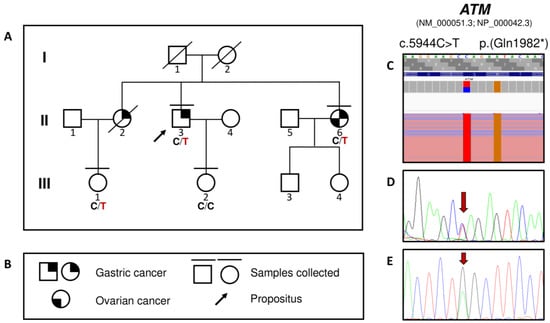 (A) Pedigree of the family. The proband (II:3) presented gastric cancer at age 45. His sister II:2 died at age 30 due to gastric cancer, while II:6 presented gastric cancer at age 52 and ovarian cancer at age 54. (B) Figure legend. (C) Visualization of the c.5944C > T ATM variant on an Integrative Genome Viewer (IGV). The BAM file is from the next generation sequencing experiment performed on II:3. (D) The Sanger validation of the variant (forward strand). (E) The Sanger validation of the variant (reverse strand).