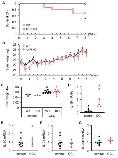 Induction of fibrosis reduced survival without affecting the body weight or liver weight of IL-19 KO mice. WT and IL-19 KO mice were treated with CCl4 twice a week for 8 weeks. Survival (n = 11–16) (A) and body weight (n = 16) (B) were monitored twice a week. * p < 0.05 vs. WT. (C) WT and IL-19 KO mice were treated with either olive oil (n = 3) (control) or CCl4 (n = 8–12) twice a week for 8 weeks. Liver weight was measured. # p < 0.05, ## p < 0.01 vs. each control. (D–G) mRNA expressions in the livers of WT mice treated with either olive oil (n = 8) (control) or CCl4 (n = 5) twice a week for 8 weeks. # p < 0.05 vs. control.