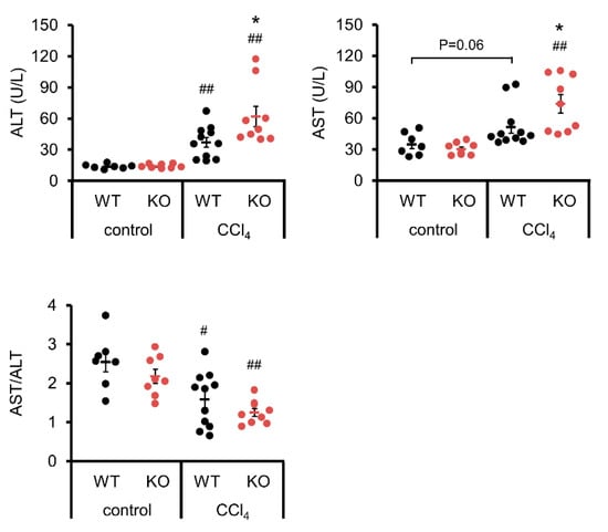 Blood tests for activities of enzymes such as ALT and AST can be used to examine the liver function. ALT was significantly enhanced in WT and IL-19 KO mice upon CCl4 administration compared to those upon vehicle control (Figure 2). AST was significantly enhanced in IL-19 KO mice, but not WT mice, upon CCl4 administration compared to those upon vehicle control (Figure 2). Upon CCl4 administration, both ALT and AST in IL-19 KO mice were worsened compared to WT mice. The AST/ALT ratio was calculated. The AST/ALT ratio decreased significantly with liver fibrosis, but there was no significant difference between WT and IL-19KO mice (Figure 2).