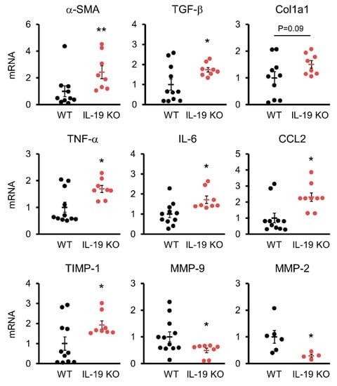 Variations in factors involved in fibrosis. mRNA expressions of several factors in the livers of WT (n = 6–12) and IL-19 KO (n = 4–8) mice that were treated with CCl4 twice a week for 8 weeks. * p < 0.05, ** p < 0.01 vs. WT.