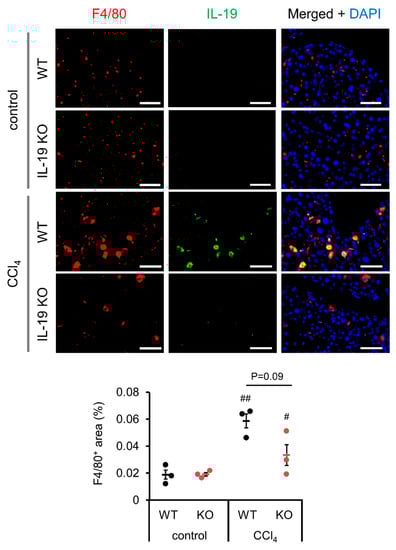 IL-19 expression is upregulated by fibrosis induction and F4/80-positive cells express IL-19. WT and IL-19 KO mice were treated with either olive oil (control) or CCl4 twice a week for 8 weeks. Representative liver sections’ immunofluorescence stainings with IL-19 and F4/80 antibodies with DAPI are shown (n = 3). Scale bar is 50 μm. F4/80-positive area was quantified using ImageJ. Positive area was expressed as % per 0.045 mm2. # p < 0.05, ## p < 0.01 vs. each control.